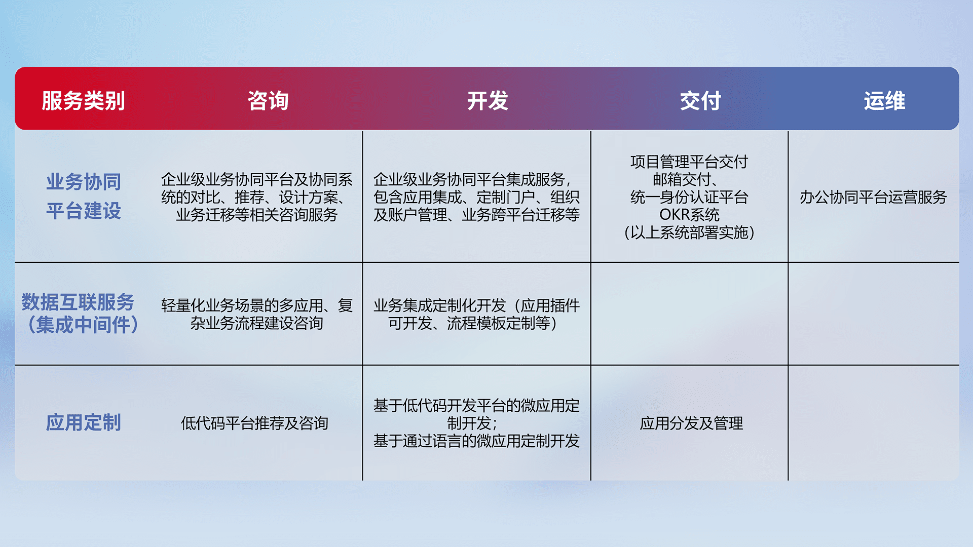 针对钉钉、、、、企微、、、、IDaas等平台级产品提供产品的规划、、、、方案、、、交付、、、、定制化开发等服务,,,,实现如统一协同办公、、、智能客户服务、、、、混合会议管理、、智能数据查询、、、等业务场景,,,实现数字化转型。。。。
